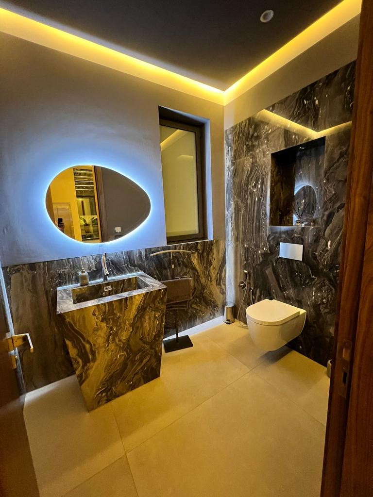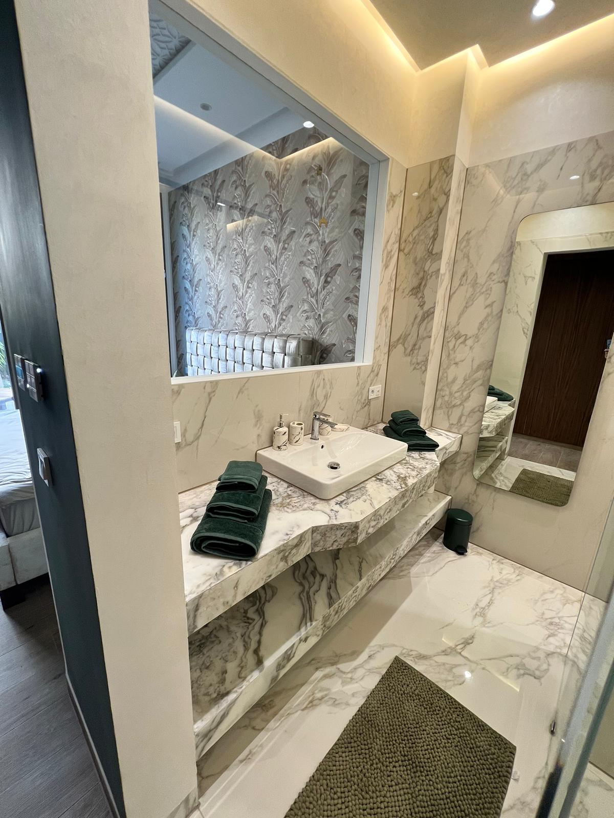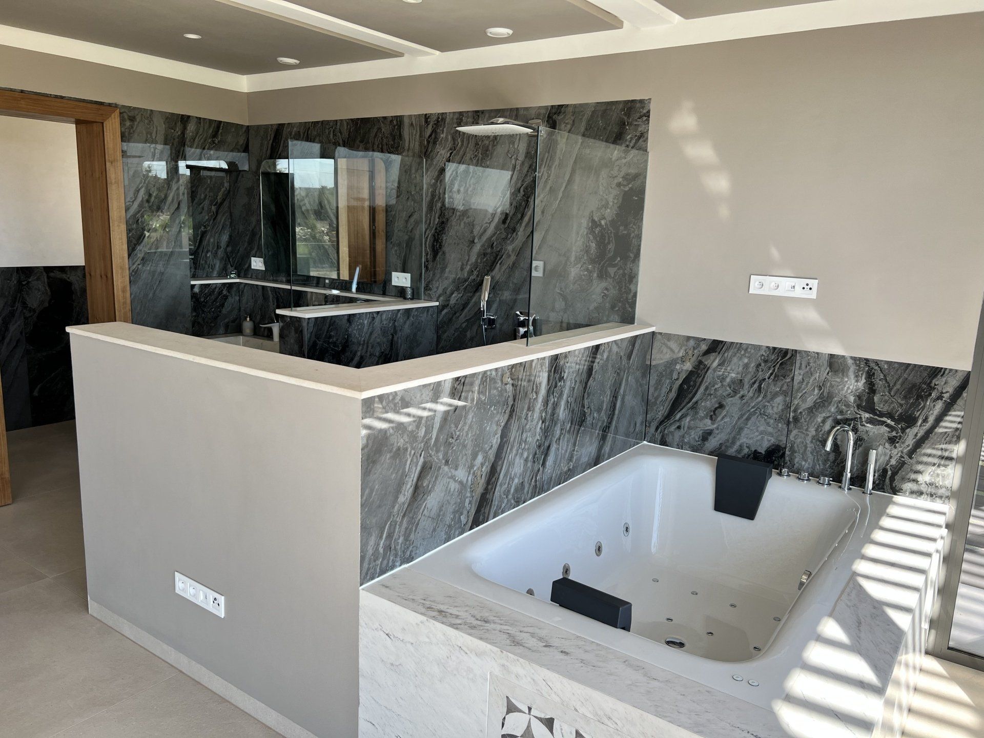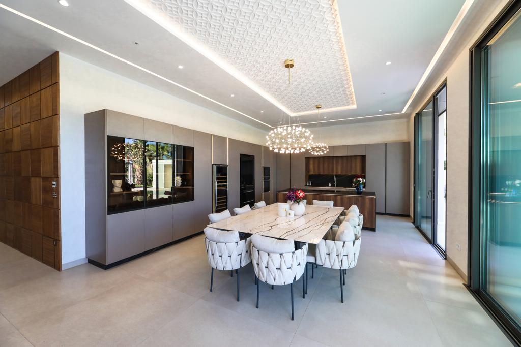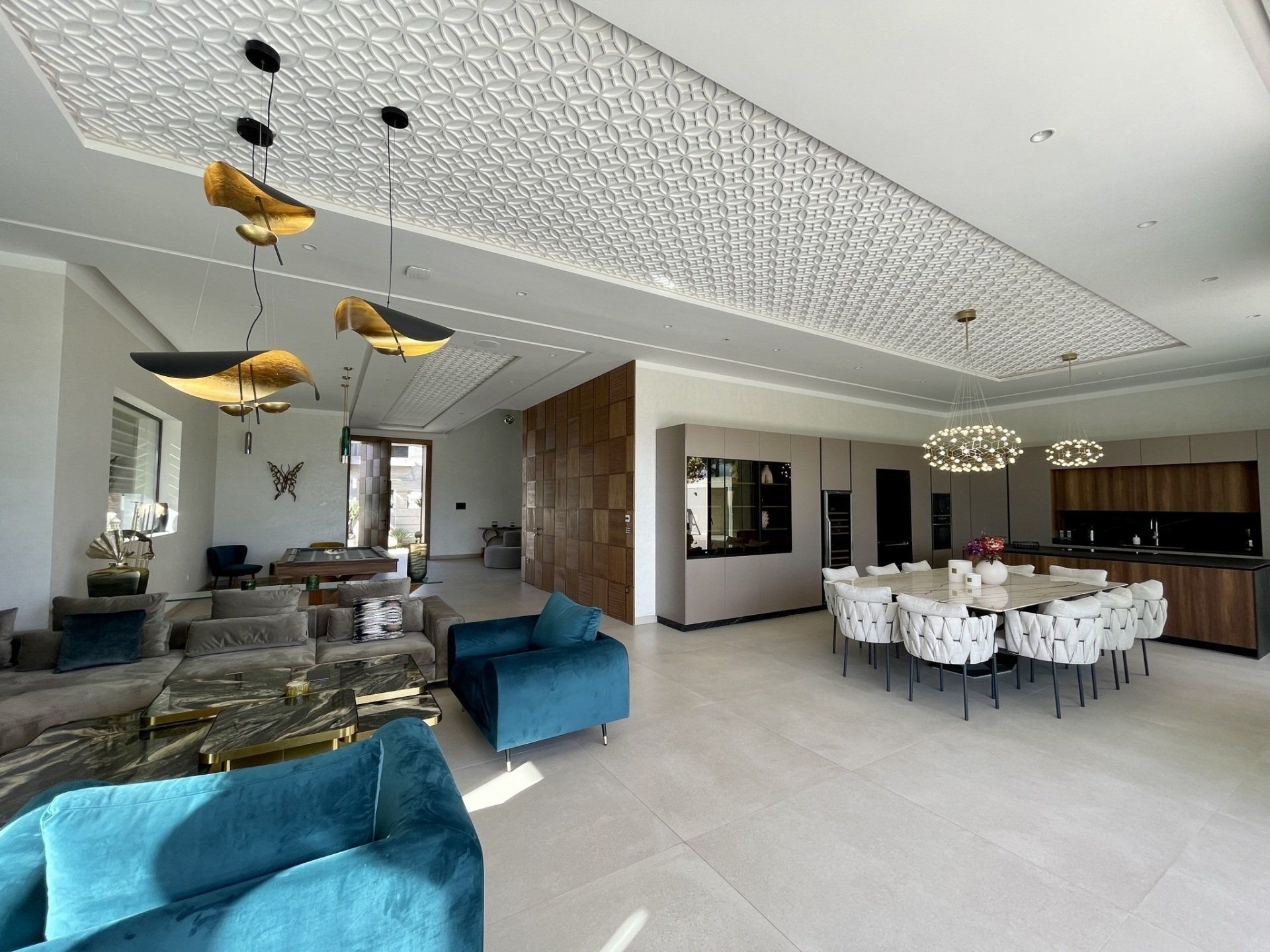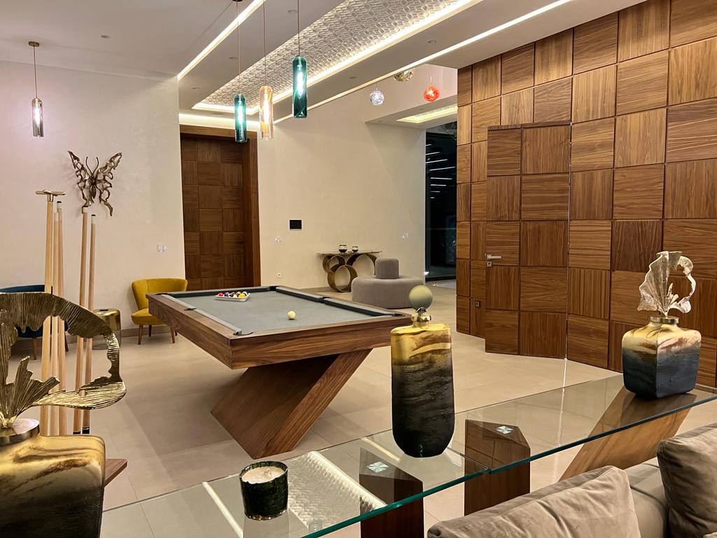 über 5 verschiedene Schlafzimmer mit modernen und einzigartigen Möbeln, exquisitem Design und jeweils eigenem Bad und WC. Darüber hinaus verfügt die Villa über ein großes Wohn- und Esszimmer mit einer modernen Küche und einem Billardtisch. Ein atemberaubendes Hamam lädt Wellness-Begeisterte zum Entspannen ein.